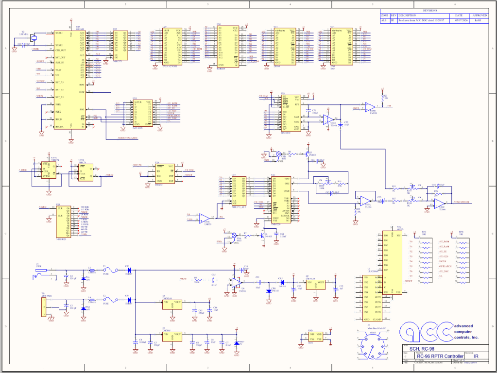 At the moment, I have about half the parts for the RC-96 (the hard-to-get half). Next, I am re-doing the schematic in my schematic capture-tool-of-choice (Circuit Studio, A.K.A Altium-Lite). There are a couple of reasons for this. One, the original is very difficult to read. If I were to have an actual, original, paper copy, it would likely STILL be difficult to read. More importantly, I need a parts list. The schematic is a great way to capture that information while producing a readable schematic (which will be made available to repeater-builder once complete). While I am at it, I can also compare the schematic against the PCB to make sure it matches the PCB. BTW, I will also have to do this for the tone panel. In this case, I will need the schematic to allow me to generate a PCB. Here is a sneak peek at page 1 of the new RC-96 schematic: